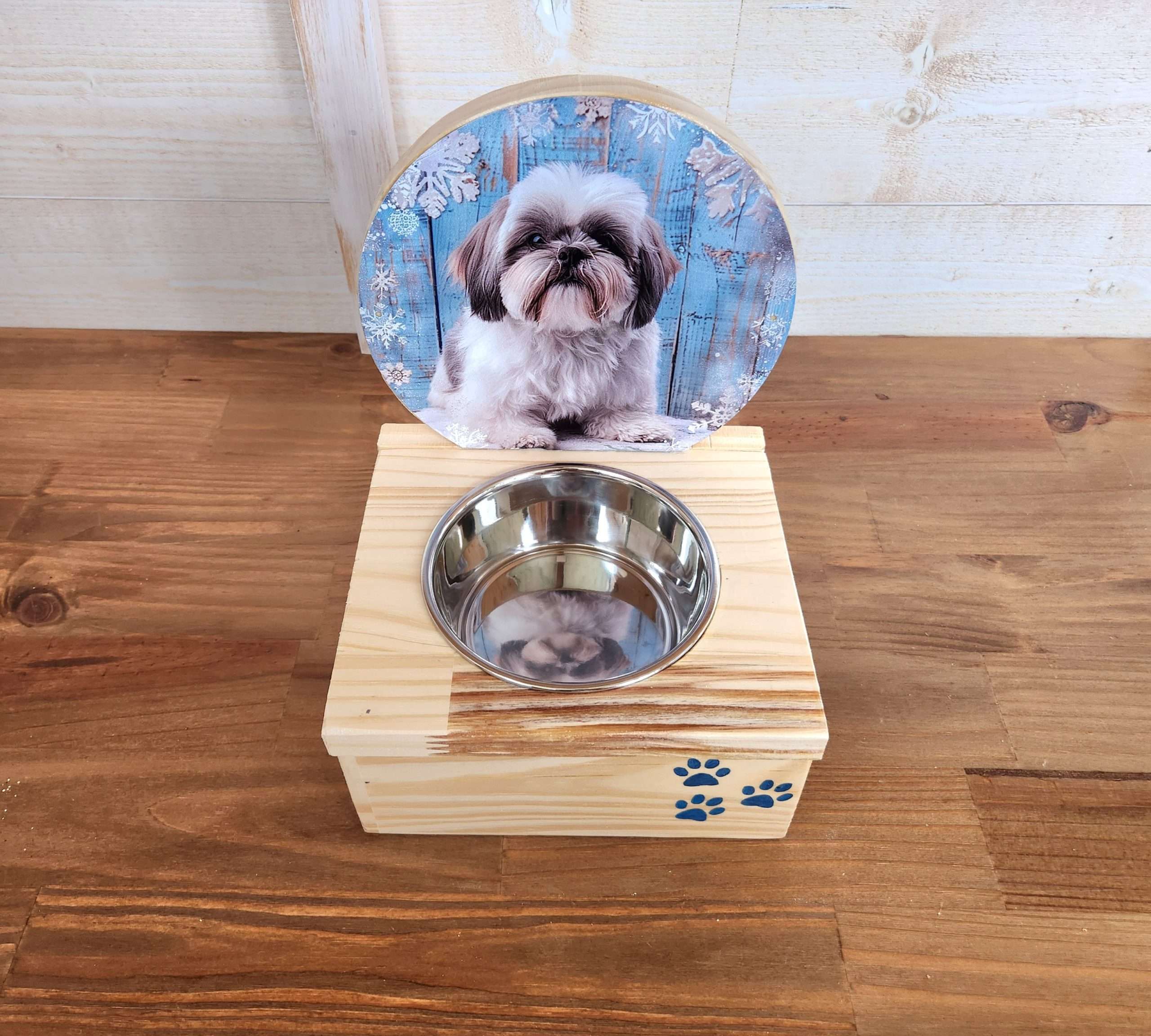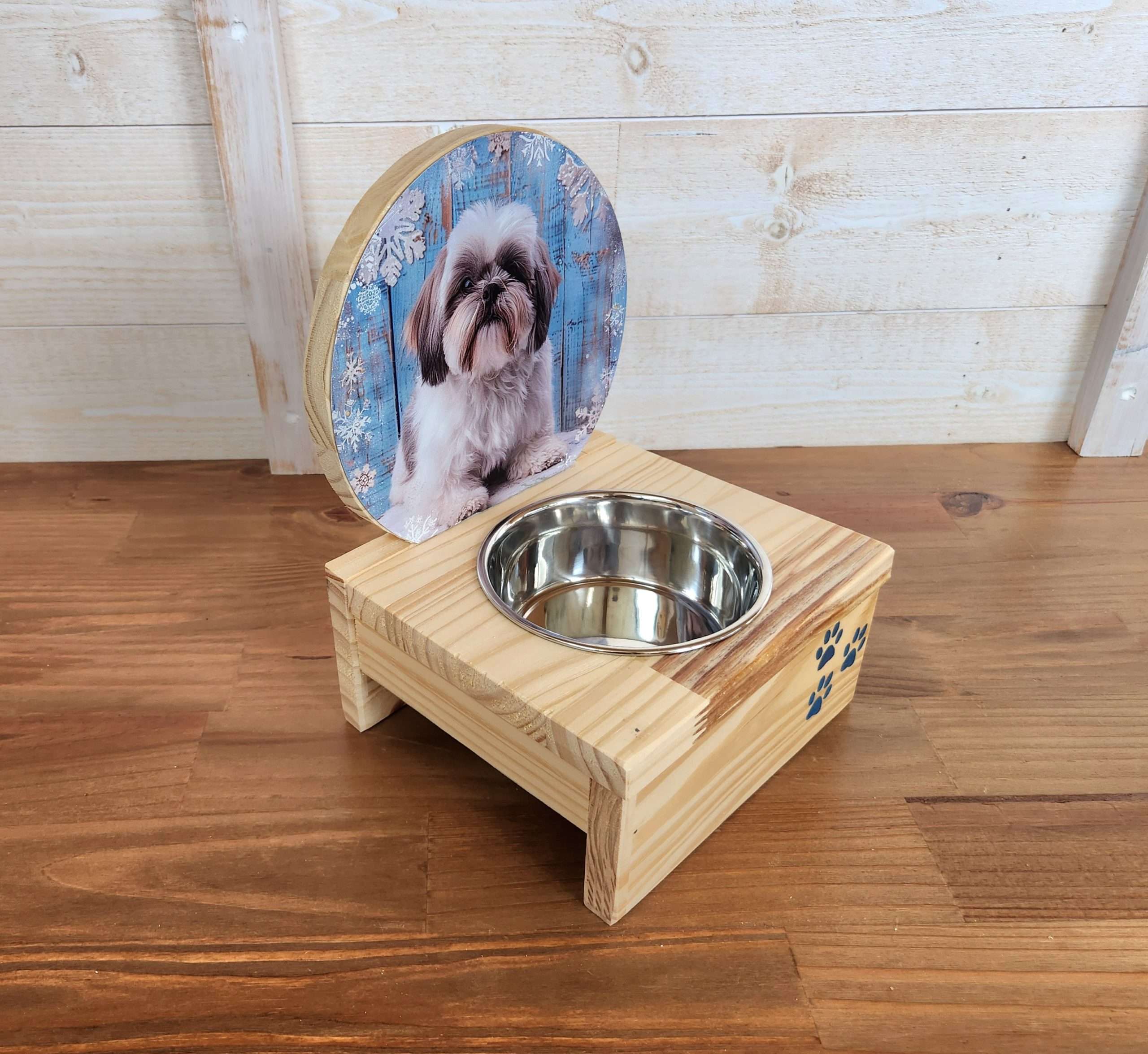 Porte gamelle pour chien en bois protégé pour un nettoyage facile.
