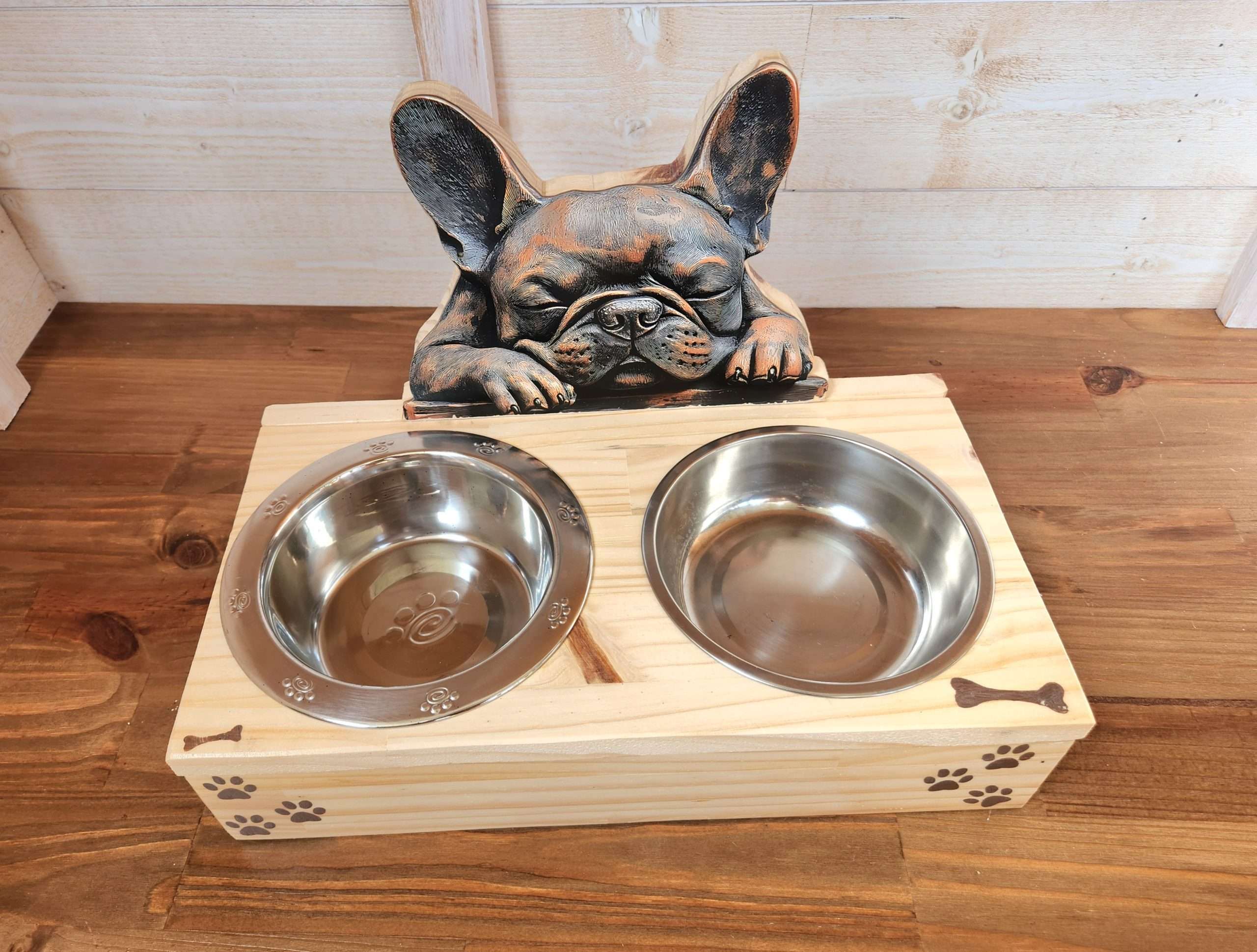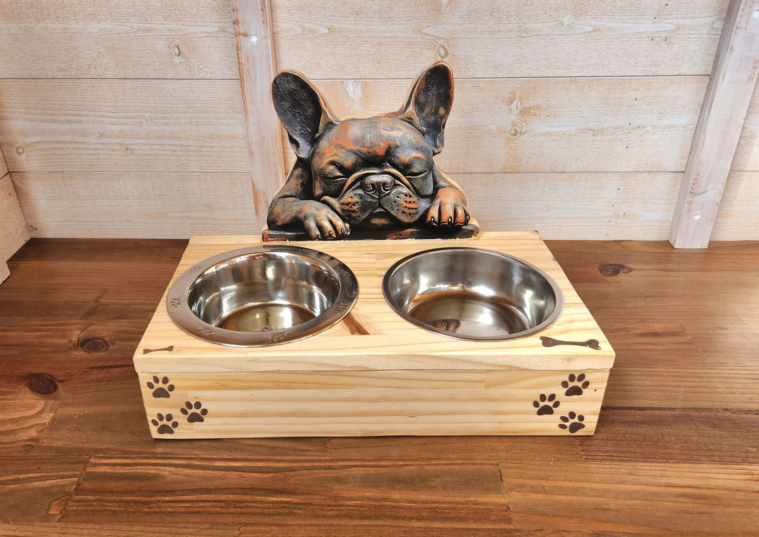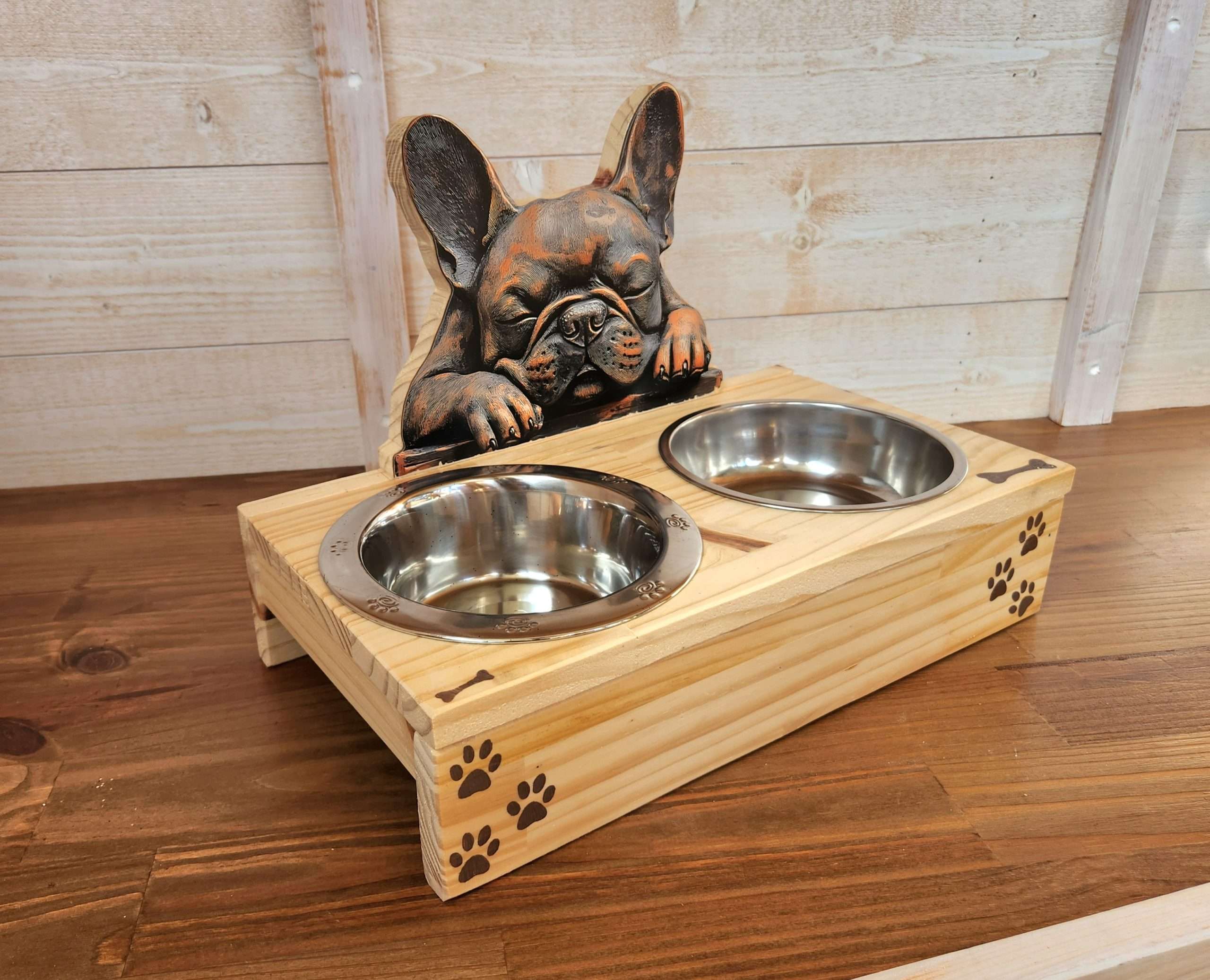 Porte gamelles pour chien en bois protégé pour un nettoyage facile.