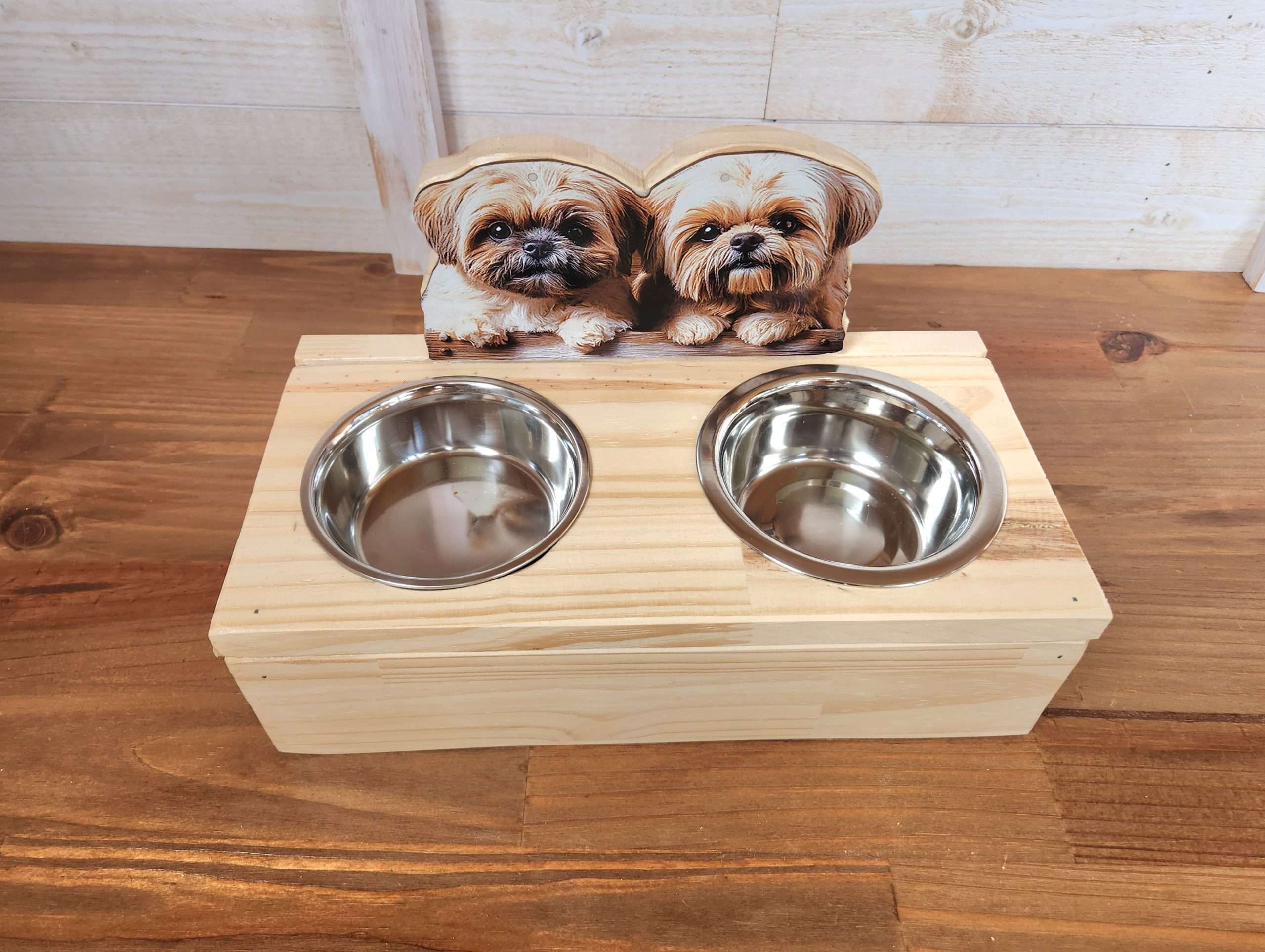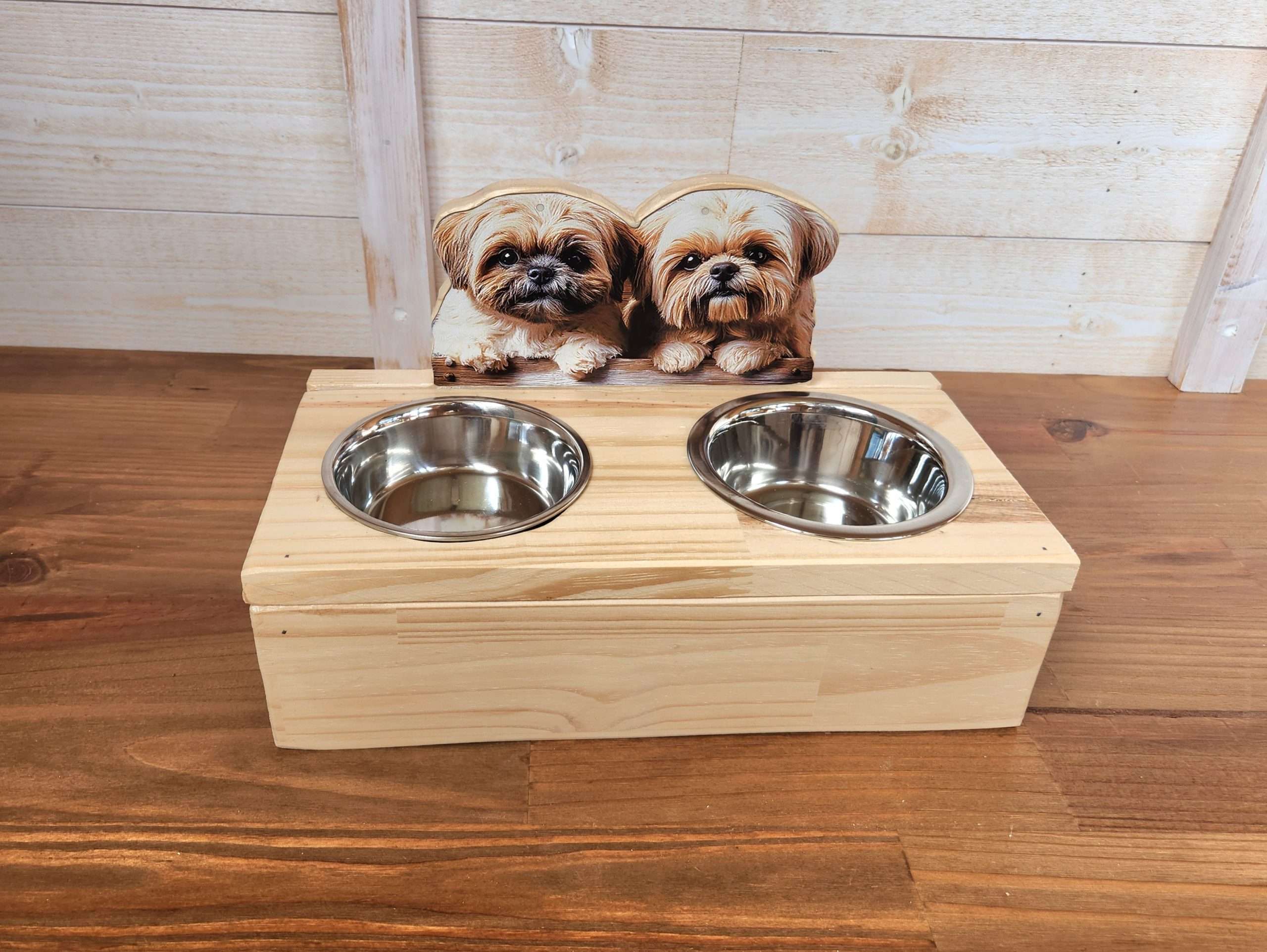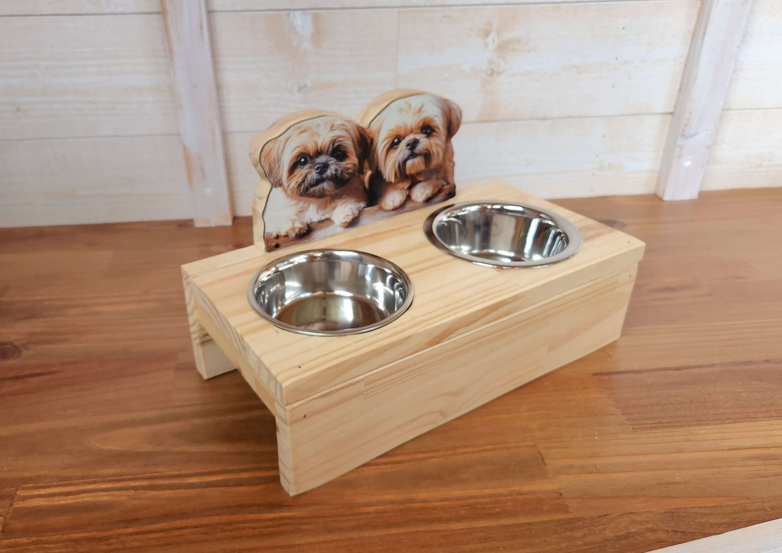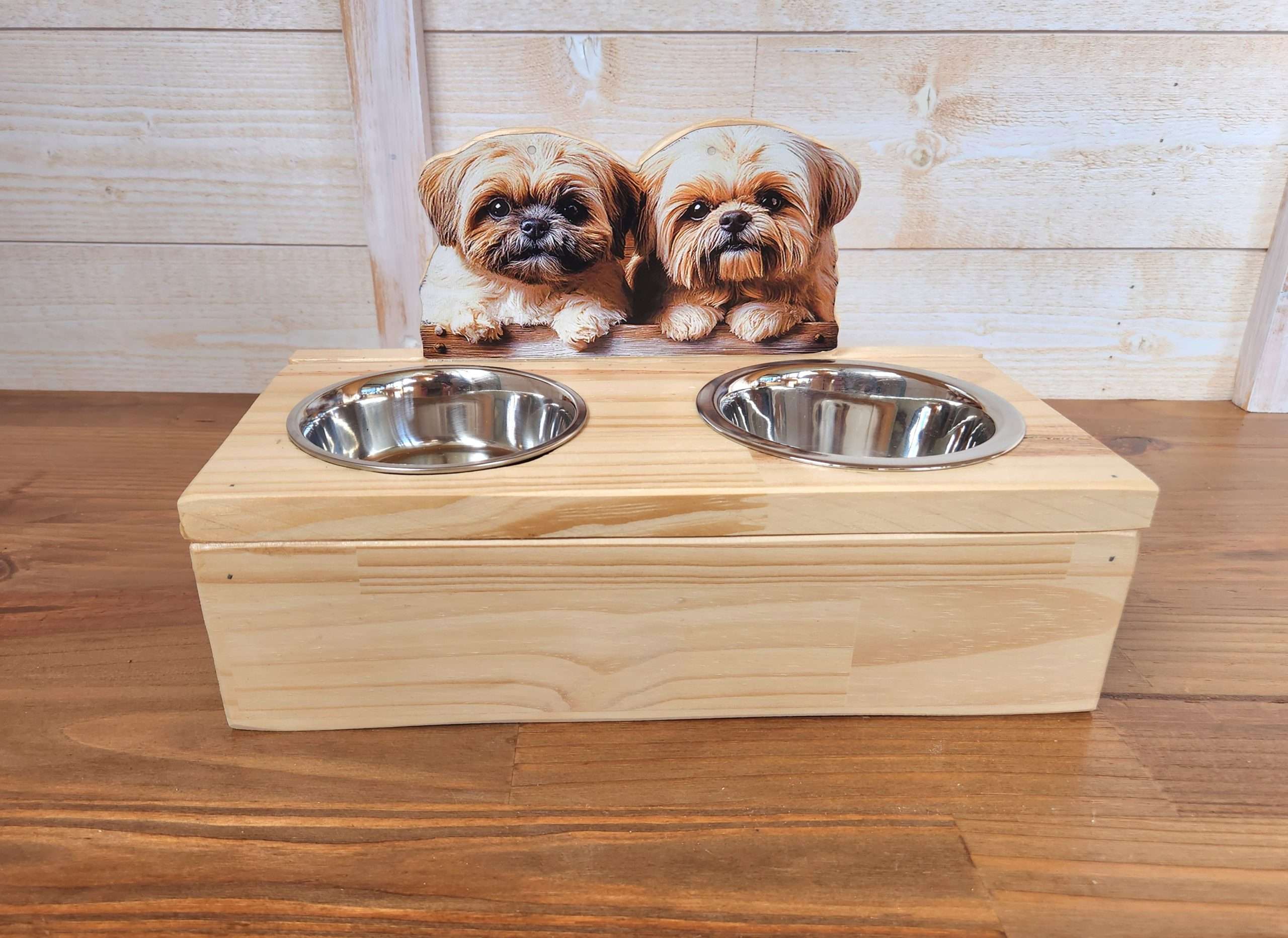 Porte gamelles pour chien en bois protégé pour un nettoyage facile.