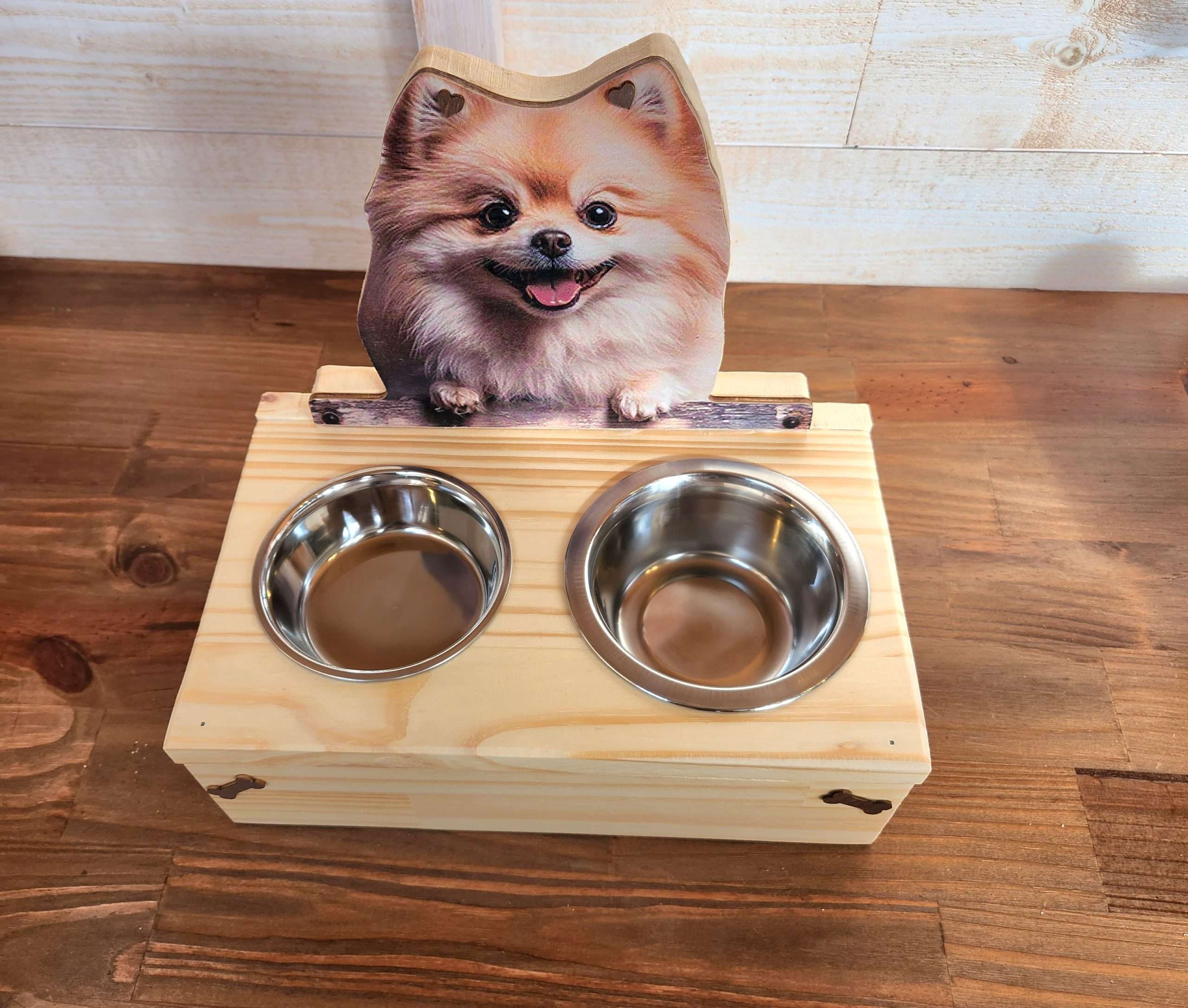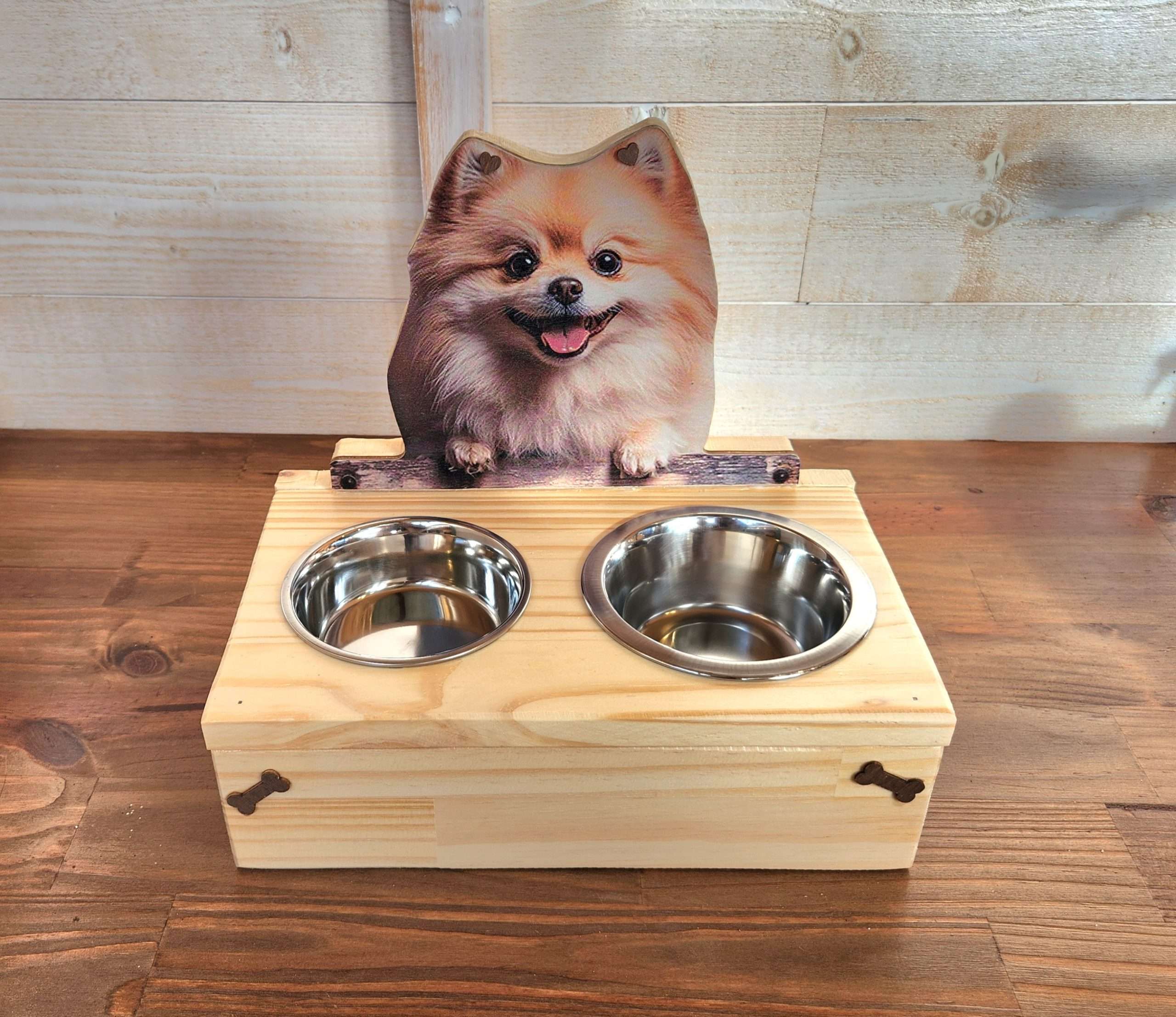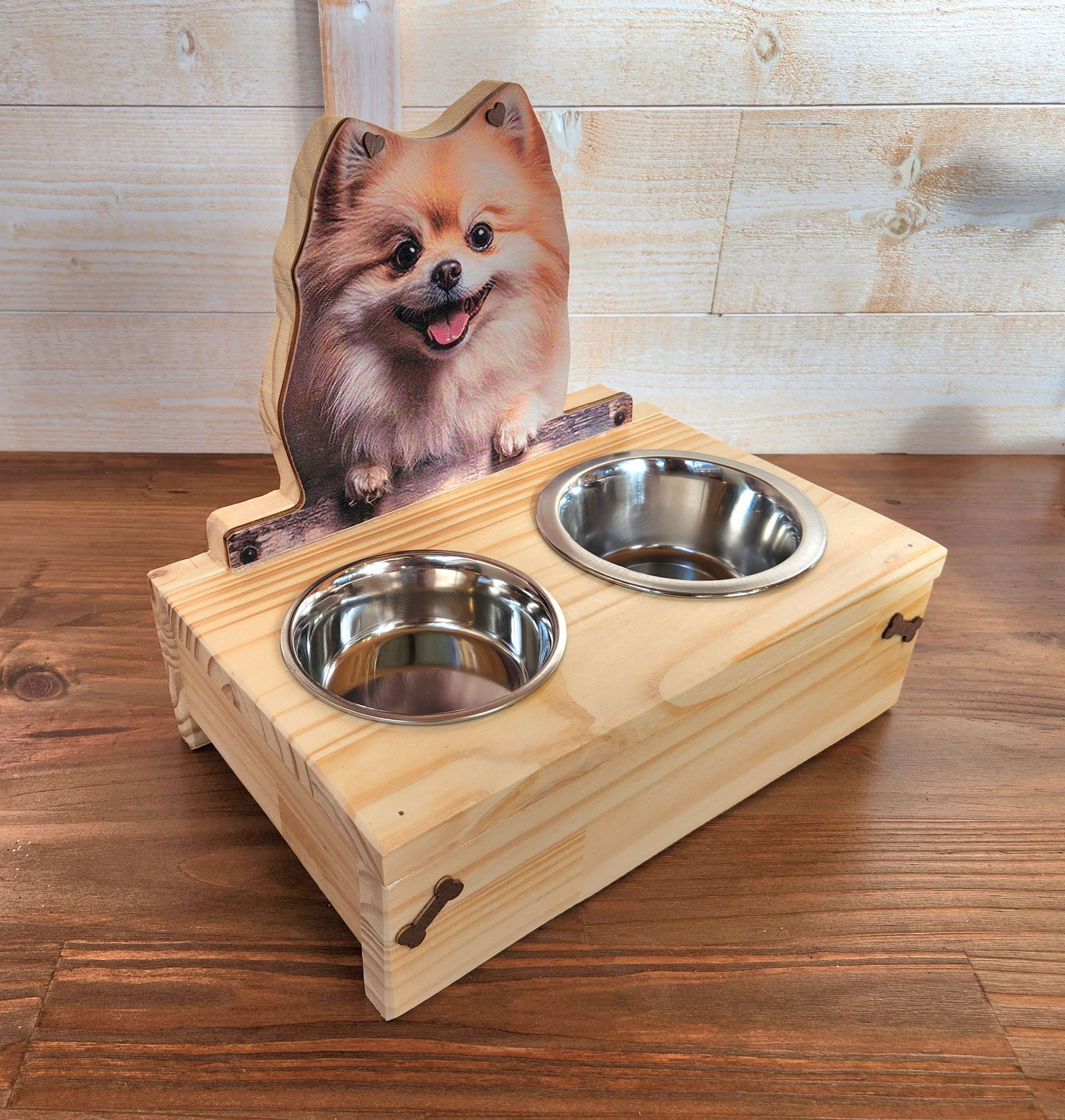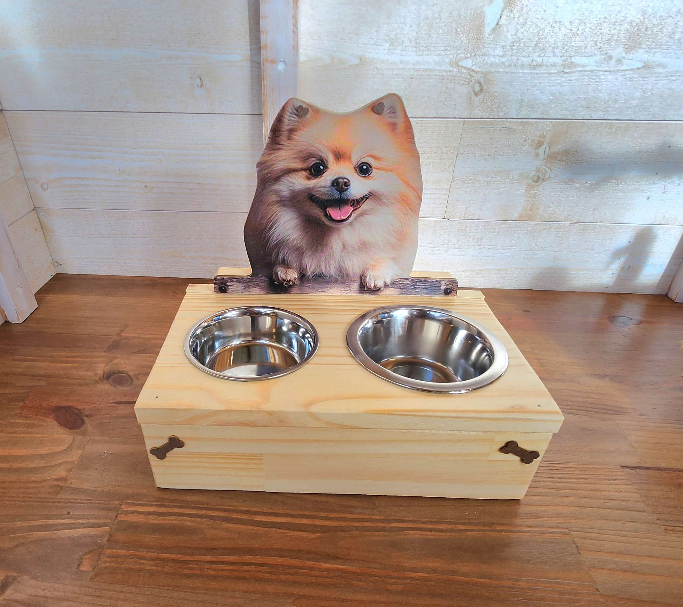 Porte gamelles pour chien en bois protégé pour un nettoyage facile.